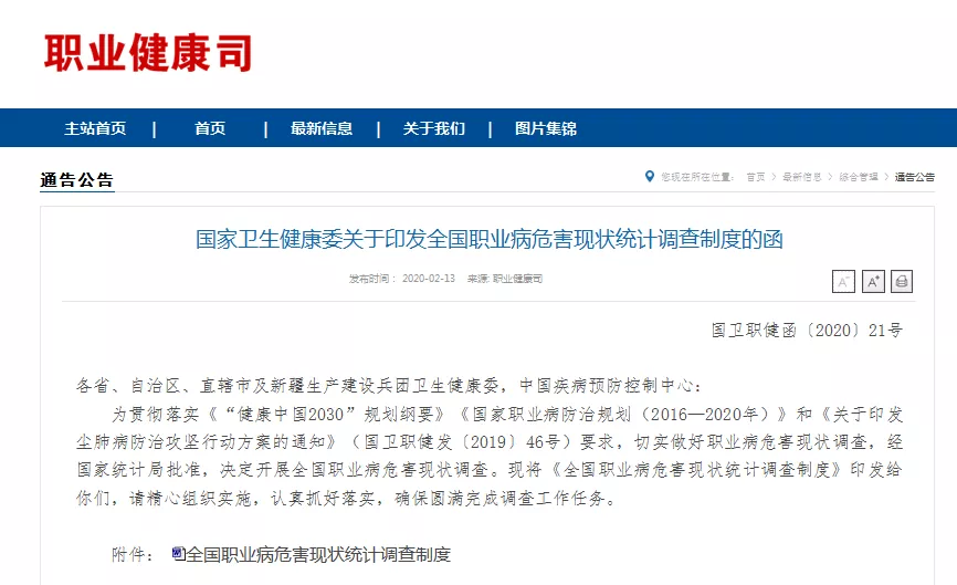 2020年1月25日,国家卫生健康委印发《全国职业病危害现状统计调查制度的函》国卫职健函〔2020〕21号,计划在2020年11月30日前,对全国32个省级单位、347个市级单位、3027个县级单位的三大行业(采矿业,制造业,电力、燃气及水的生产和供应业等)中从业人员10人及以上的用人单位进行职业病危害现状调查,通过对企业基本情况、职业病危害情况和职业健康管理情况的调查统计,建立完善我国职业病危害现状数据库,为进一步加强职业病防治工作提供基础依据。此次职业病危害现状调查为建国后首次进行的职业卫生普查工作,范围广规格高,由国家卫生健康委员会和国家统计局批准后实行。