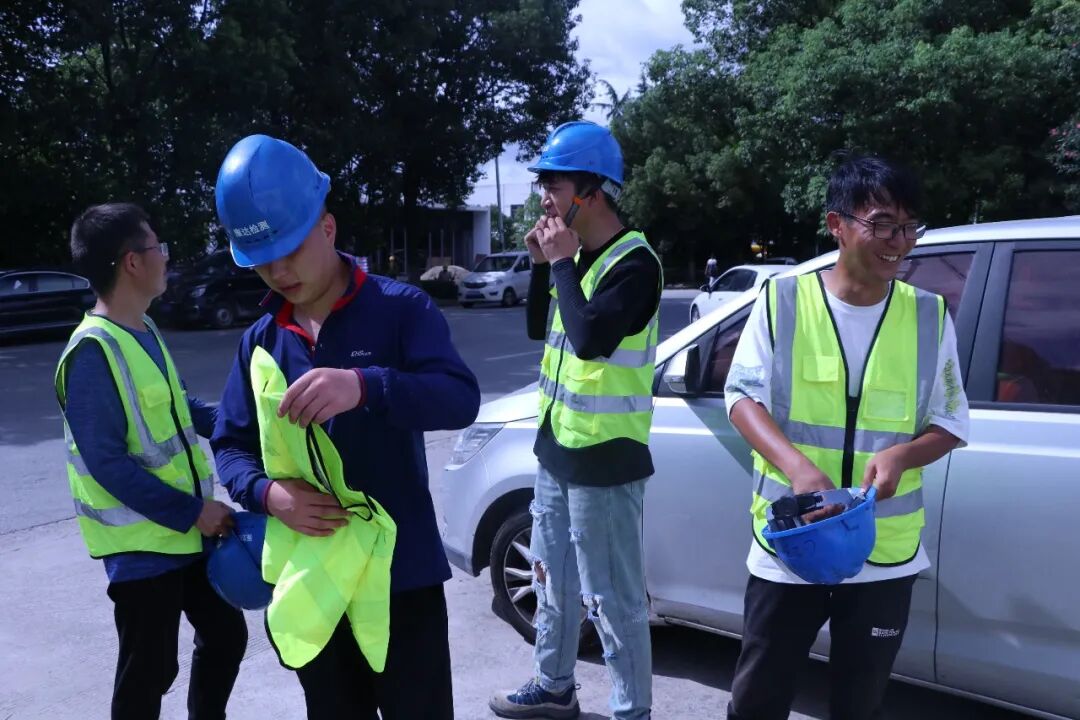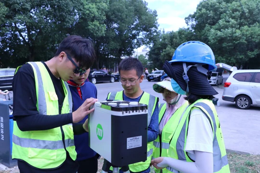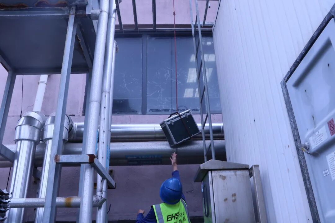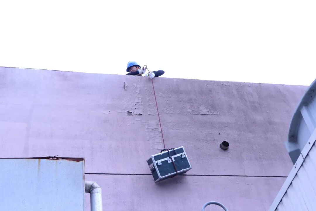 因为采样的仪器很重,只能用安全绳把仪器一个个吊上楼顶,这任务也是很艰巨的,但队员之间的配合很好,这都是工作中的默契。