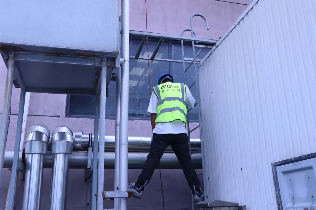 为了监测数据的精准,他们要迎着高温爬上楼顶,登上指定高度的排气筒采集废气。想要爬上去并非容易事,采样现场的环境不可控,又多变。但不论有哪种情况,他们都是迎难而上的!